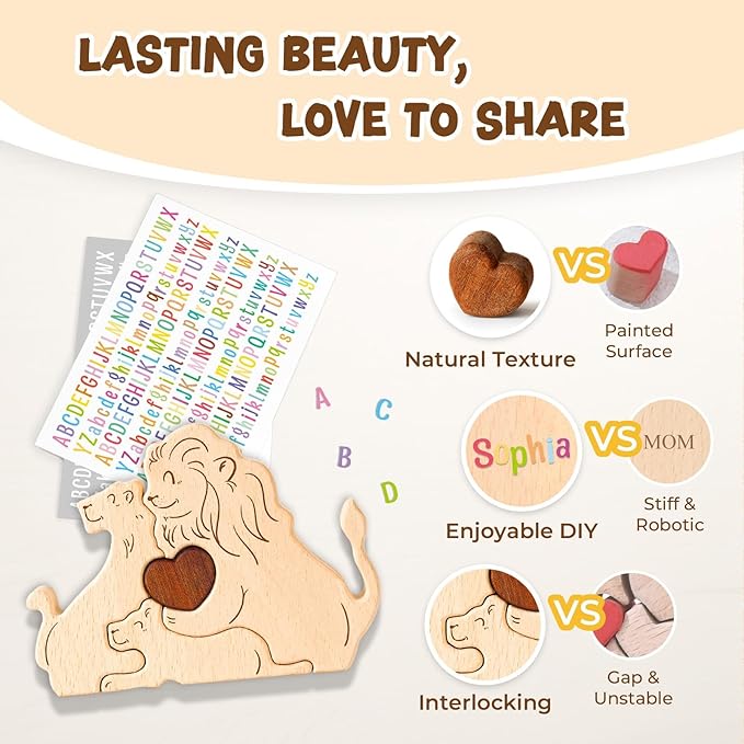 - Perfect for Family Bonding - This puzzle is not only a beautiful decorative piece but also a family games for kids and adults. It’s a great way to spend quality time with your little ones, as they work alongside you to assemble the Lion family. To make it even more special, the set includes colorful and white letter stickers, allowing you to personalize it with names or meaningful words. Create a unique keepsake while enjoying a fun and interactive bonding experience