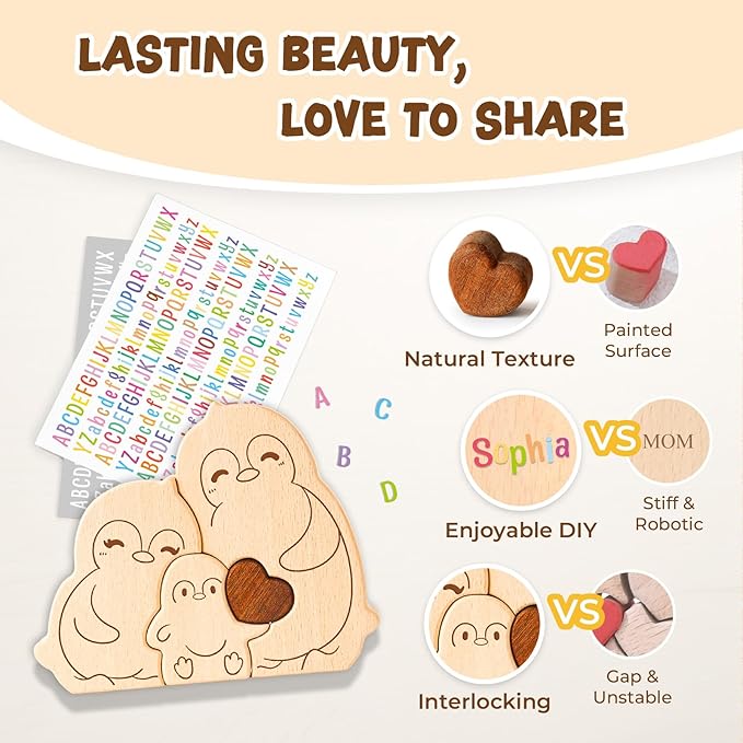 - Perfect for Family Bonding - This puzzle is not only a beautiful decorative piece but also a family games for kids and adults. It’s a great way to spend quality time with your little ones, as they work alongside you to assemble the Penguin family. To make it even more special, the set includes colorful and white letter stickers, allowing you to personalize it with names or meaningful words. Create a unique keepsake while enjoying a fun and interactive bonding experience