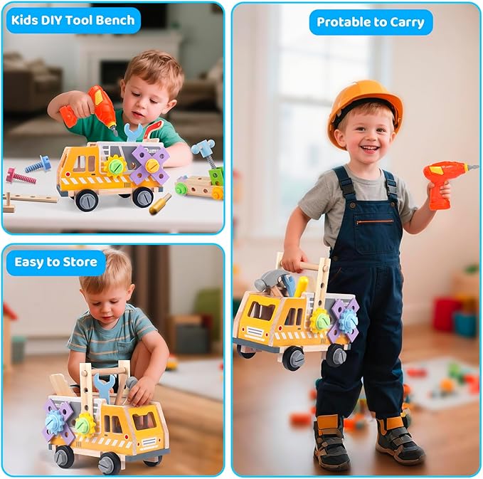 - ๐โ3-in-1 Kids Toys Tool Set: Combines a toy truck, play table, and organized storage in a wooden truck bench, boys toddlers love driving the truck and using exterior holes for design exploration. Slide-open top compartment holds tools; detachable handle makes cleanup and travel easy.