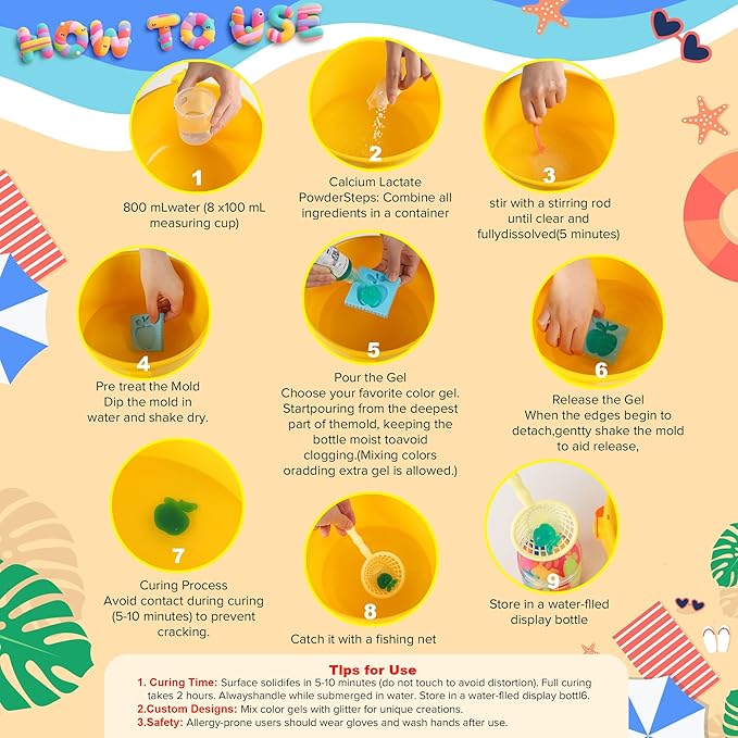 - Create Magic Water Elf Pets: Kids can make their own magical water pets using 20 colors of magic gel and 16 water pet molds. Tip: After demolding, keep the creation in magic water for 30-60 minutes to fully solidify and "grow". Store in water or a sealed bag after play to extend lifespan. Exposure to air will cause drying and shrinkage.