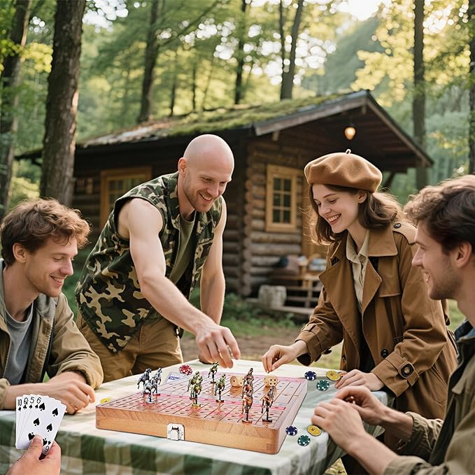 - SUPERIOR CRAFTSMANSHIP: Features 11 racehorses, each crafted from solid metal, long-lasting and resistant to damage. The racing board is entirely wooden, a meticulous polishing process results in a flawlessly smooth surface, free from any rough edges or burrs. The foldable design of the board serves a dual purpose, functioning as a storage case for the racehorses and dice, thereby simplifying organization and storage