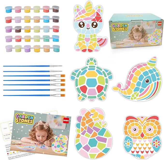 - Creative Fun: Our Stepping Stones Painting Kit for Kids includes unicorns, dinosaurs, turtles, owls, whales 5 different patterns of stepping stones, 5 sets of paints strips; 1 mixing color pads; 7 paintbrushes. Let your child freely design unique stepping stones, whether for garden paths or patio decorations, to show their personal style.