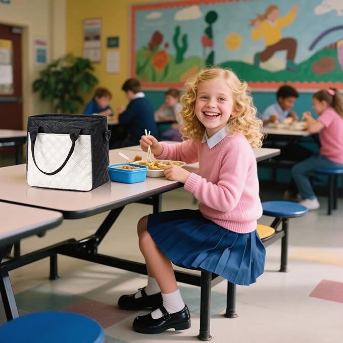 Cute Stylish Small Insulated Lunch Bag for Women Men Kids, Ultrasonic SoftTouch LunchBox for School, Office, Picnic, Durable Lunch Tote with Adjustable Strap & Dual Zippers, Black&Cream