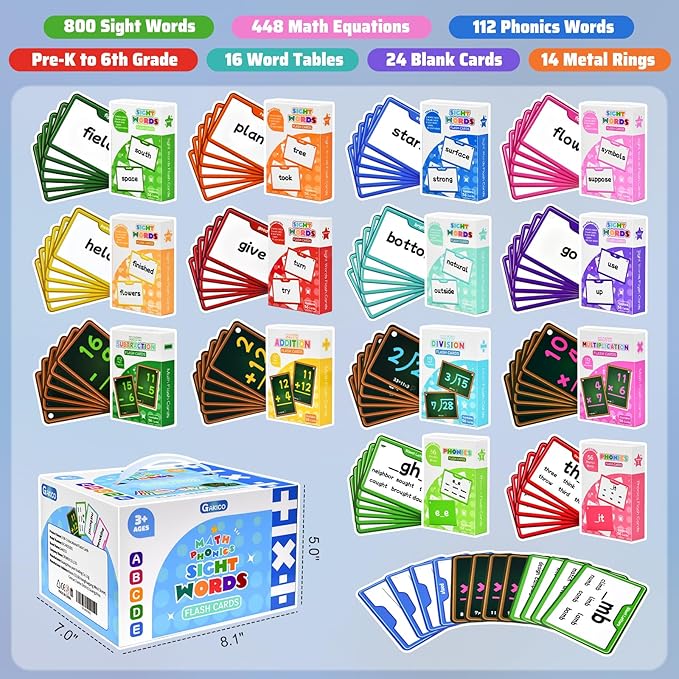 - Package Contents: The package comprises 14 boxes of flashcards, including 8 boxes of sight word cards (Pre-K to 6th grade), 2 boxes of phonics word cards, and 4 boxes of math flashcards covering addition, subtraction, multiplication, and division. Each box contains 56 flashcards. Each sight word box includes 50 sight word cards, 3 blank cards, 2 word sheet cards, and 1 word game card featuring 4 interactive games