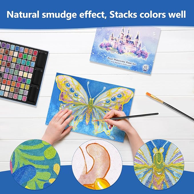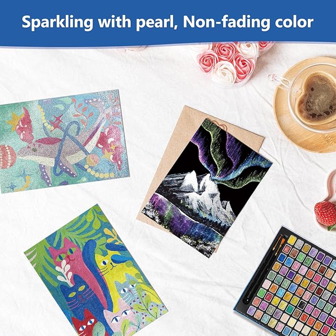 - 【Smooth Strokes, No Powder Off】Our watercolors paint set are extremely durability. Glitter watercolor remain highly stable, drying without crumbling or fading, making the watercolor painting shine forever. The fine powder texture makes the strokes of the pearl paint smooth and resists clumping