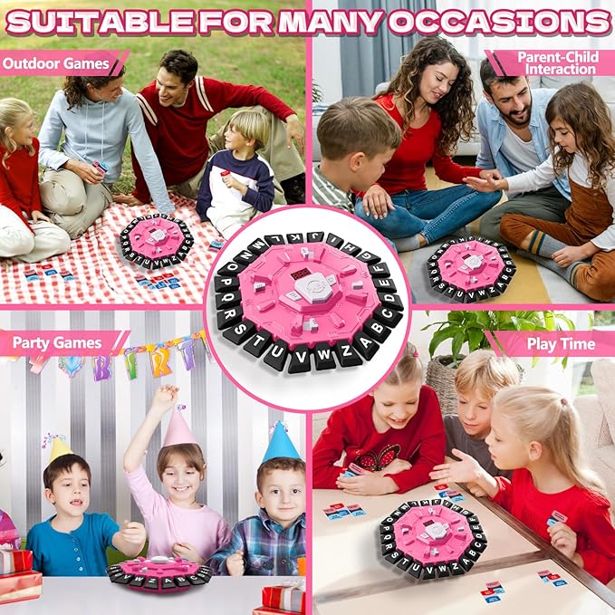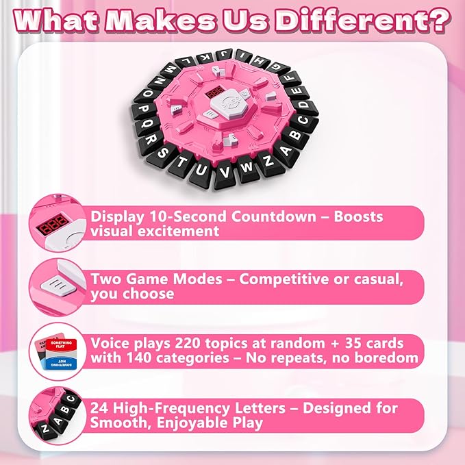 - Digital Display: Alphabet wheel includes digital display and built-in timer, 24-letter board offers limitless word combinations, 35 double-sided cards (140 categories). Simple rules for all ages