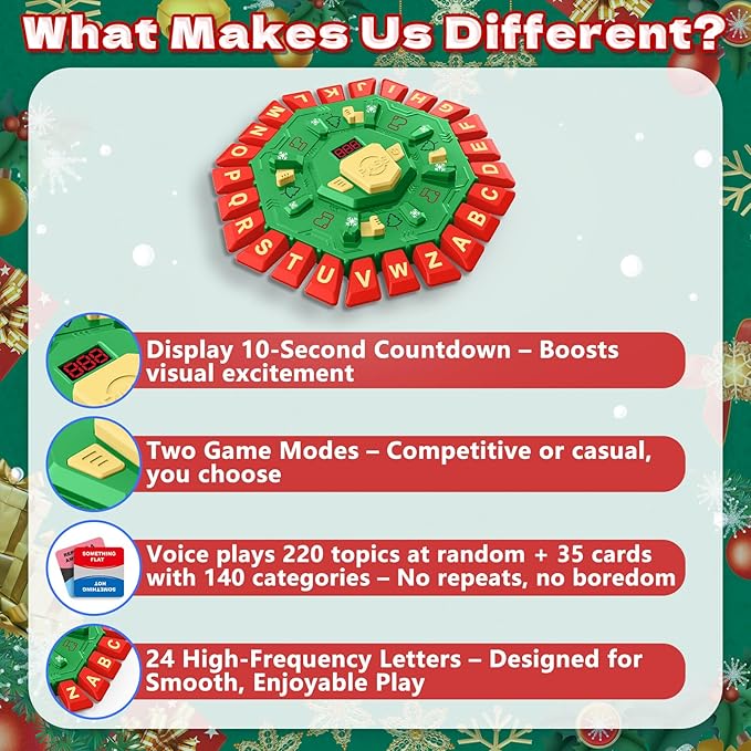 - Digital Display: Alphabet wheel includes digital display and built-in timer, 24-letter board offers limitless word combinations, 35 double-sided cards (140 categories). Simple rules for all ages