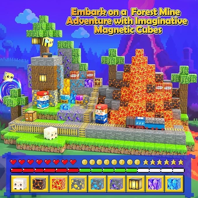 - MAGNETIC BUILDING BLOCKS: Let's explore the mysterious mine cave with this 150pcs magnetic blocks and explore the magworld of infinite possibilities! Each building block is UV printed, and the lifelike patterns inspire kids to imagine scenes such as forest cabins, mines and mine tracks. Rich elements such as grass, leaves, lava, mine, tracks and miners allow kids, boys & girls to immerse themselves in role-playing, constantly stimulating imagination, creativity and concentration