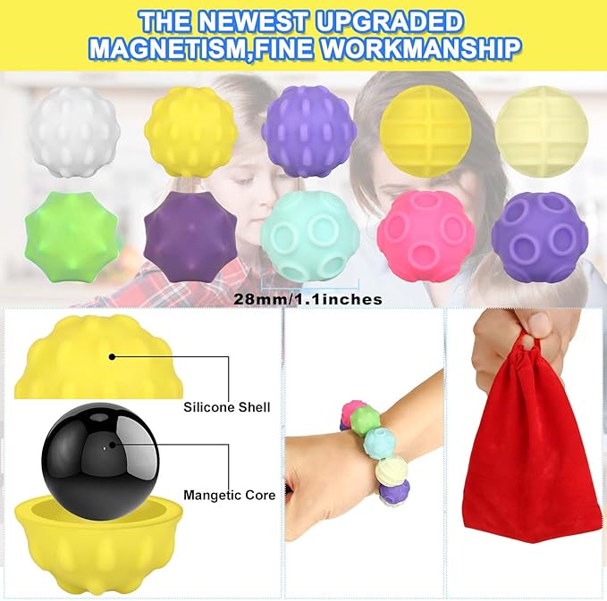 - 1️⃣Creative Texture Toys: These sensory balls are a super value choice. They are a 10-piece colorful magnetic fidget pack, including yellow, purple, light blue, pink, light green, off-white, dark purple, and white. Wrapped in soft silicone, Rich colors increase the appeal, and they are brighter and more tactile than ordinary sensory balls. Their rounded corners are designed to keep you safe. They are durable and washable.
