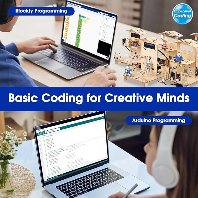 - INNOVATE CRAFTS FOR CREATIVITY - This QE024-Level 1 smart home kit contains five scenarios of automatic pet feeder, automatic clothes drying rack, access control, security alarm, and automatic watering.This DIY wooden toys also can be painted to create a unique craft. The finished product are very suitable for display on a table, shelf or showcase in a children's bedroom, playroom or study area. Note: Each kit only has one controller board, so only one of these projects exists at a time.