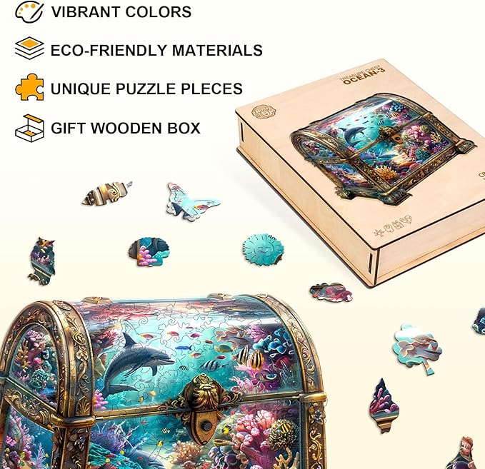 Wooden Puzzles for Adults, Treasure Chest Ocean Wooden Jigsaw Puzzle Unique Shape Animal Wood Puzzles Adult 3D Visual Effect, Birthday Gifts for Puzzle Lovers Family Games (M-11.4 * 11in-190pcs)