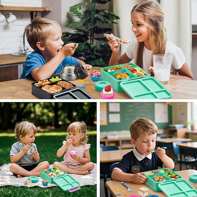 - Leak Proof Bento Box and Food jar: Our lunch boxes and insulated thermo food jar are made of food grade materials.Each compartment is individually sealed with a lid to prevent stringing and leaking.The bento lunch box is designed with 1 child-friendly latch for easy opening and closing by little hands.