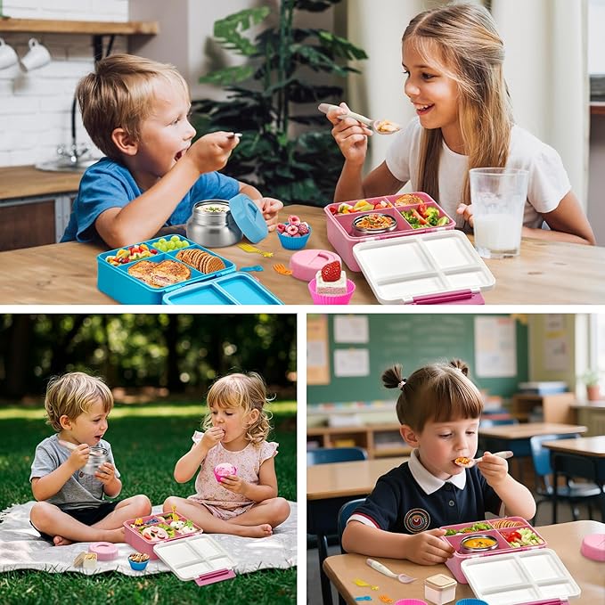 - Leak Proof Bento Box and Food jar: Our lunch boxes and insulated thermo food jar are made of food grade materials.Each compartment is individually sealed with a lid to prevent stringing and leaking.The bento lunch box is designed with 1 child-friendly latch for easy opening and closing by little hands.