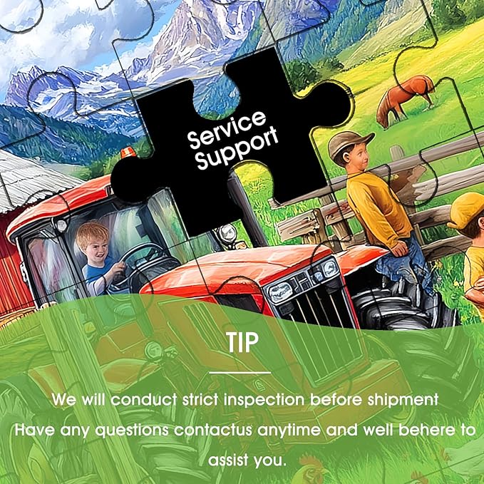 - Perfect Pattern: This is a vibrant farm puzzle. A red tractor sits near a wooden fence, with a child inside. Three kids chat nearby. Chickens and roosters roam the grass. In the distance, horses graze by a fence, a red barn stands, and majestic mountains under a blue sky complete the pastoral scene.