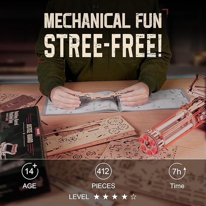 - 36-Shot Rubber Band Unleashed: Load 36 elastic bands at once for relentless suppression! The 6-barrel rotating chamber delivers overwhelming firepower in seconds – perfect for recreating the iconic roar during tactical play. Assemble this iconic wooden puzzle to challenge spatial intelligence – ultimate satisfaction for model weapon enthusiasts!