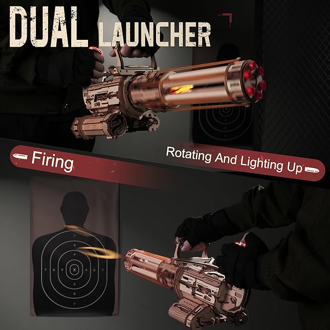 - Dual-Trigger Dominance: Experience authentic rotating-barrel machine gun operation with independent electric & mechanical triggers: Master the rotating barrel via electric trigger while controlling rubber band bursts with the press-fire trigger. Synced dragon flame light effects intensify rapid-fire immersion.