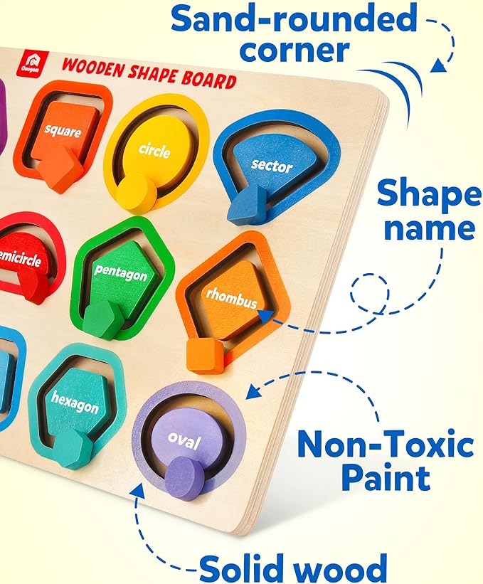 - Sorting Shape Puzzle Toy for Travel: The compact size of this wooden fine motor color shape peg board makes it an essential for home, restaurant, car, or plane travel, keeping toddlers quiet and engaged. The multiple shapes are finely incised, with the name of each shape written in respective grooves of shape. Through matching the puzzles, toddlers learn the shapes and colors visually and got to name each shapes by sight.