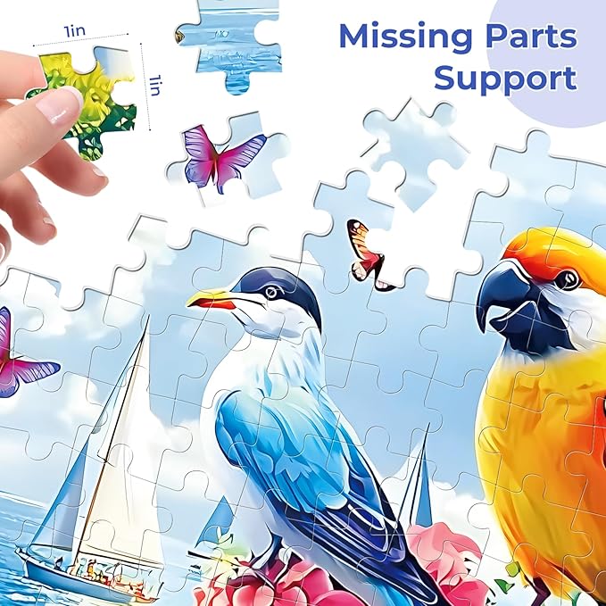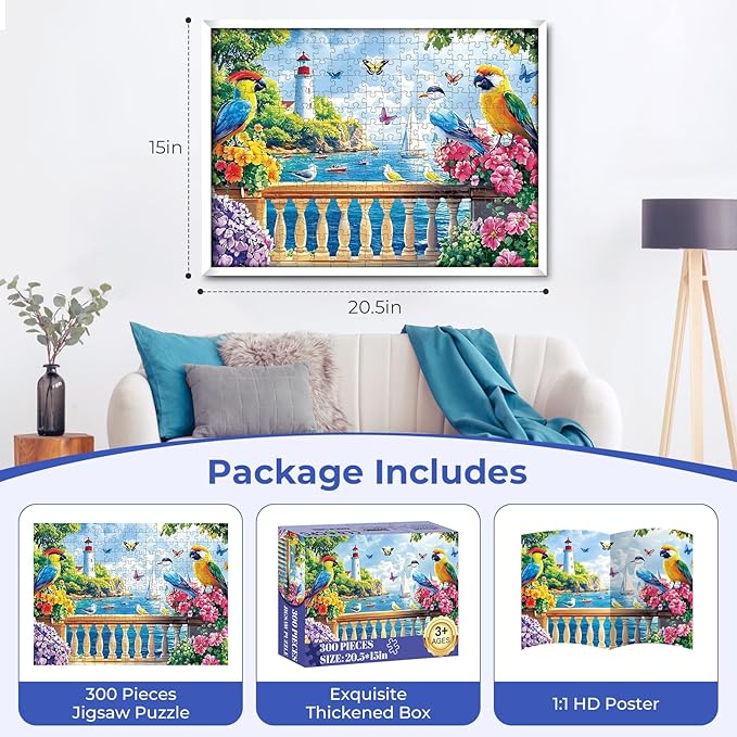 - 300 Pieces Coastal Puzzle: Colorful parrots, butterflies, sailboats, and a lighthouse create a vibrant and lively summer scene. Immerse yourself in the joy of ocean breezes, sunshine, and the freedom of flight.