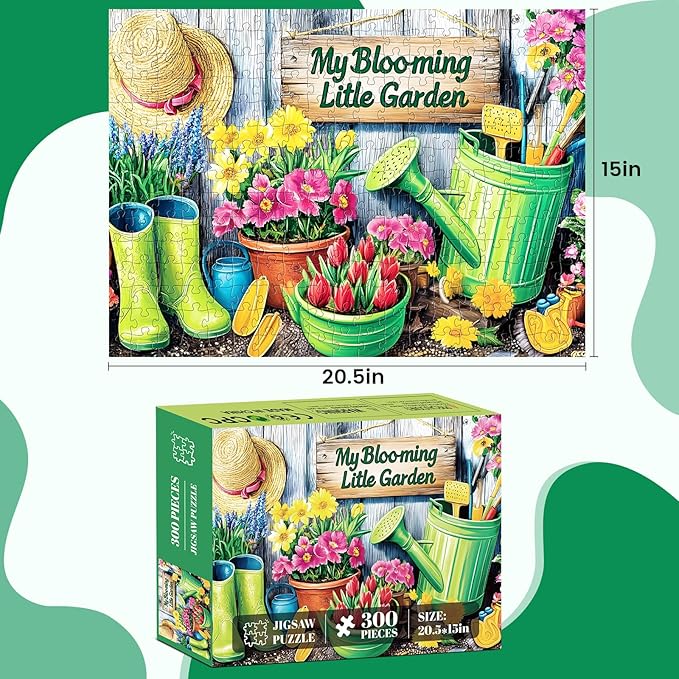 - Plants Jigsaw Puzzles:The jigsaw puzzles 300 pieces for adults presents a cozy little garden scene. Colorful flower pots are placed on the ground, with bright green rain boots, watering cans and other items dotted around, creating a vibrant and lively gardening atmosphere.