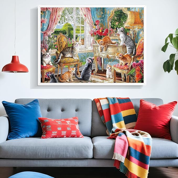 - Elegant and Delightful Scene: Each cat strikes a unique and playful pose, bringing charm and personality to the artwork. A golden vanity and classic European-style chair add a touch of vintage luxury, while lush greenery outside the window and vibrant indoor flowers create a warm and elegant atmosphere.