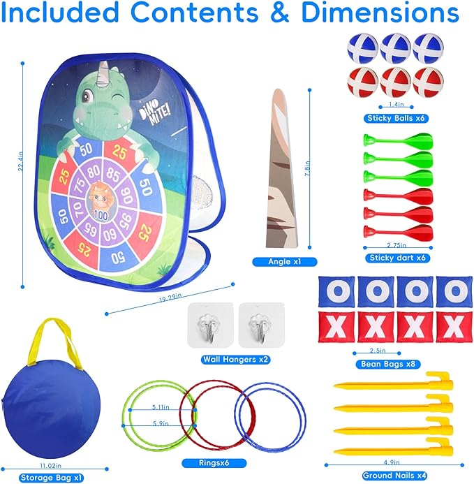- 【WHAT'S IN THE BOX】 3IN1 Board x 1, Bean Bags x 8, Sticky Balls x 6, Sticky Darts x 6, Colorful Rings x 6, Ground Stakes x 4, Wall Hangers x 2, Storage Bag x1. Note: Please slow down when removing from the Storage Bag to avoid popping out too fast