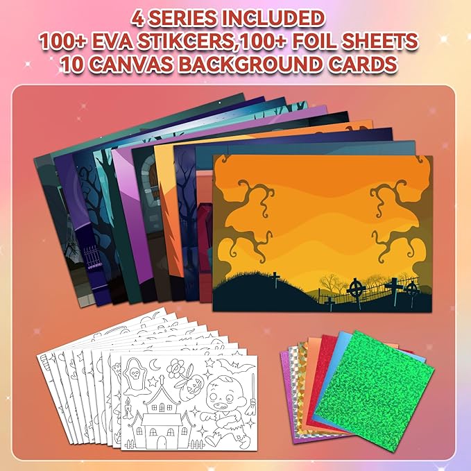 - 200+ Halloween Craft Supplies: Get everything needed for spooky fun: 10 detailed picture canvases, 100+ shimmering foil sheets, 120+ festive foam stickers, and visual instructions.