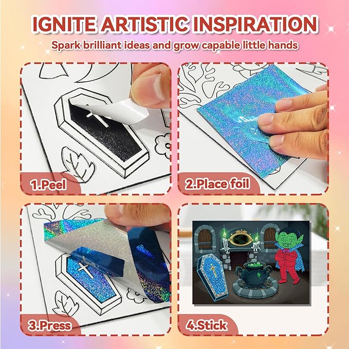 - 100% Glue-Free Spellcraft: Forget sticky potions and messy brews! Our pressure-activated foil art creates sparkling Halloween scenes without any glue, paints, or messy materials. Just peel, press, and create!