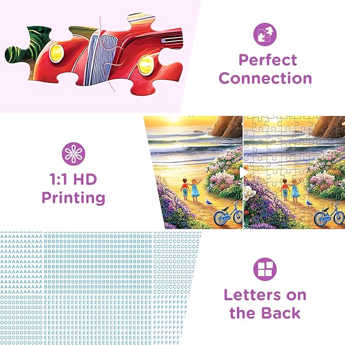 - Romantic Seaside Puzzle: The afterglow of the setting sun spills onto the sea, dyeing the sky into a purple and orange gradient. A vintage red car adds a touch of vitality. The cottage is bright and cozy, with flowers blooming all around. Two children hold hands and gaze at the sea.All of these creates peaceful and gentle atmosphere!