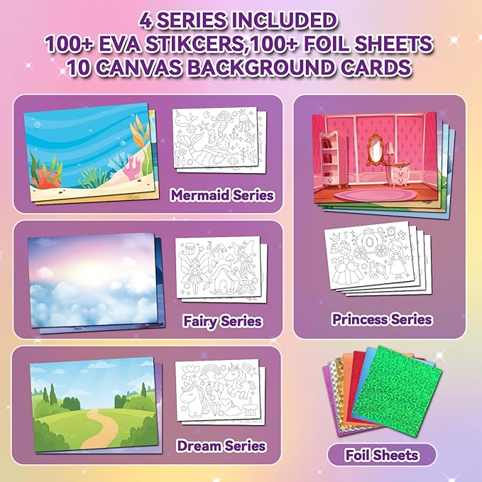 - Magical Mess-Free Foil Craft Art for Kids:Create dazzling princess, fairy and unicorn artwork with zero cleanup! Our innovative no-glue technique lets kids focus purely on creativity without any sticky mess.