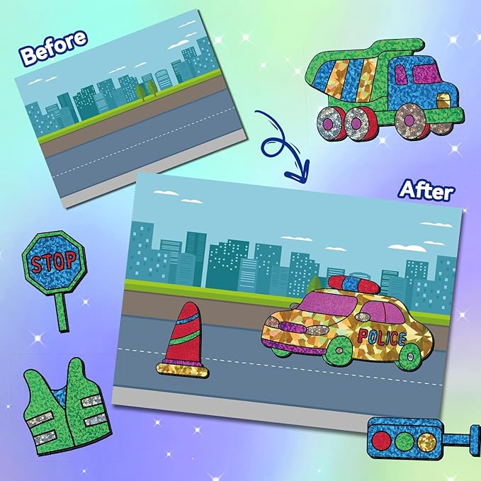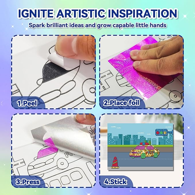 - Magical Mess-Free Foil Art for Kids: Create dazzling spaceships, dinosaurs, and construction vehicles with zero cleanup! Our innovative no-glue technique lets kids focus purely on creativity without any sticky mess.