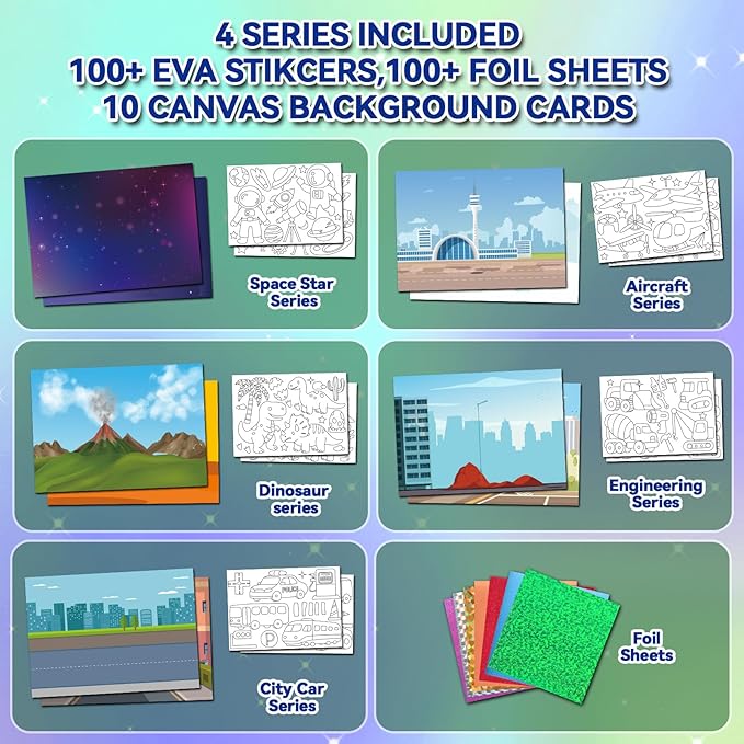 - 200+ Various Craft Supplies: Get everything needed for endless adventures: 10 detailed picture canvases (Space Dinosaur Traffic Construction & Airplane), 100+ metallic foil sheets, 120+ foam stickers, and visual instructions.