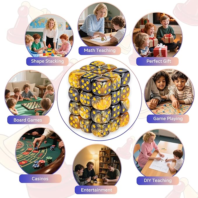 - Wide Range of Application: Board Games Dice,Durable dice set for classic games like Craps, Yahtzee, Backgammon, Boggle, Monopoly, Dungeons and Dragons, Tenzi, Liar's Dice, Farkle, Bunco, and so much more!,dice also make excellent Teacher's aids,Perfect item for playing at home with your family or at a party.