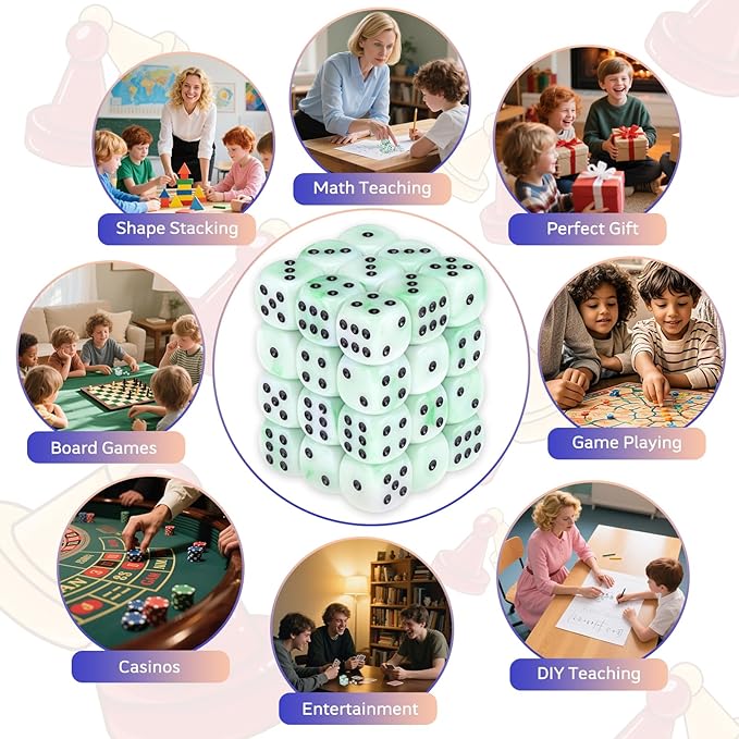 - Wide Range of Application: Board Games Dice,Durable dice set for classic games like Craps, Yahtzee, Backgammon, Boggle, Monopoly, Dungeons and Dragons, Tenzi, Liar's Dice, Farkle, Bunco, and so much more!,dice also make excellent Teacher's aids,Perfect item for playing at home with your family or at a party.