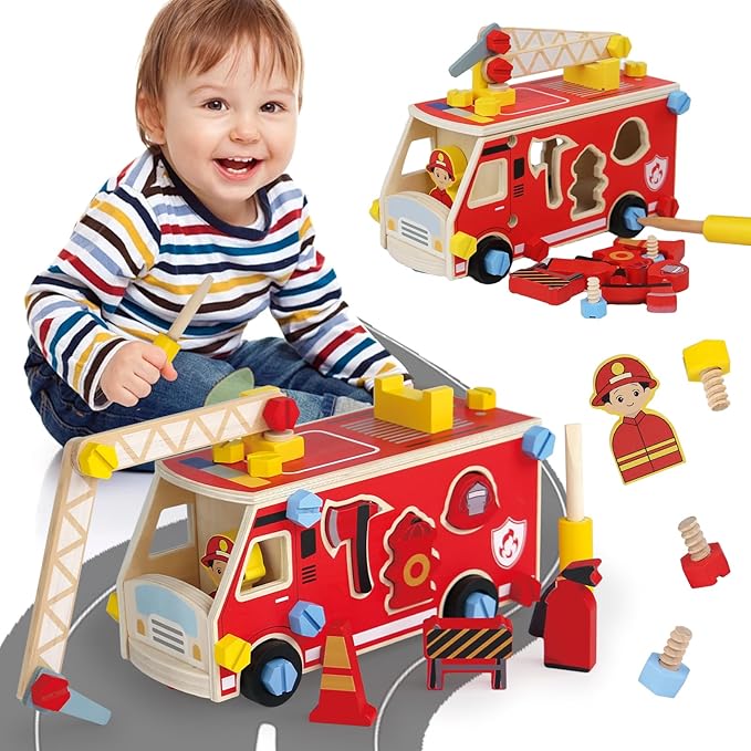 - [Montessori Fire Truck STEM Toy] This wooden fire truck toy is more than just fun—it supports early STEM learning and Montessori principles. Kids age 3+ will develop fine motor skills, spatial reasoning, and creative thinking while exploring how fire tools and shapes fit together.