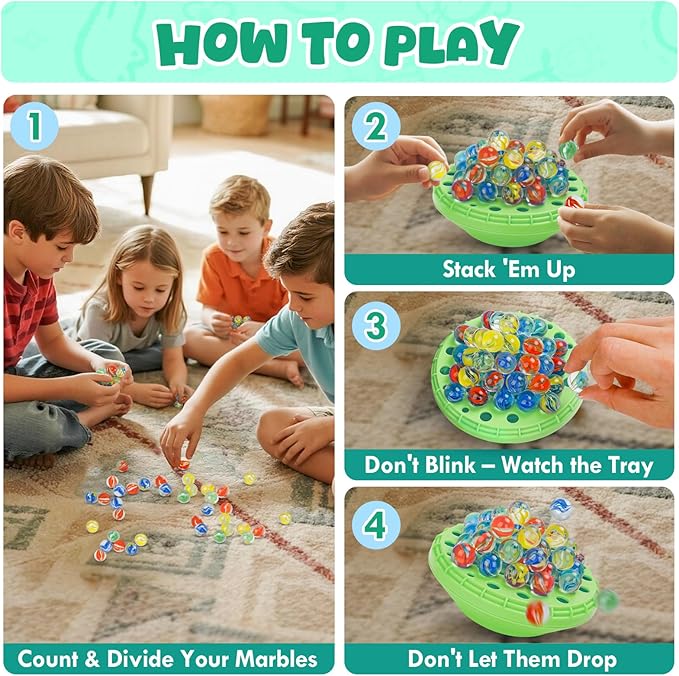 - 🟢Thrilling Multiplayer Action: 50 vibrant glass marbles paired with a wobbly, tilt-sensitive base—supports 1-4 players for competitive fun. One wrong nudge, and your marbles come crashing down! Perfect for family game nights, birthday parties, or casual get-togethers that need an extra spark.