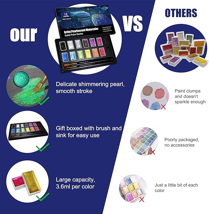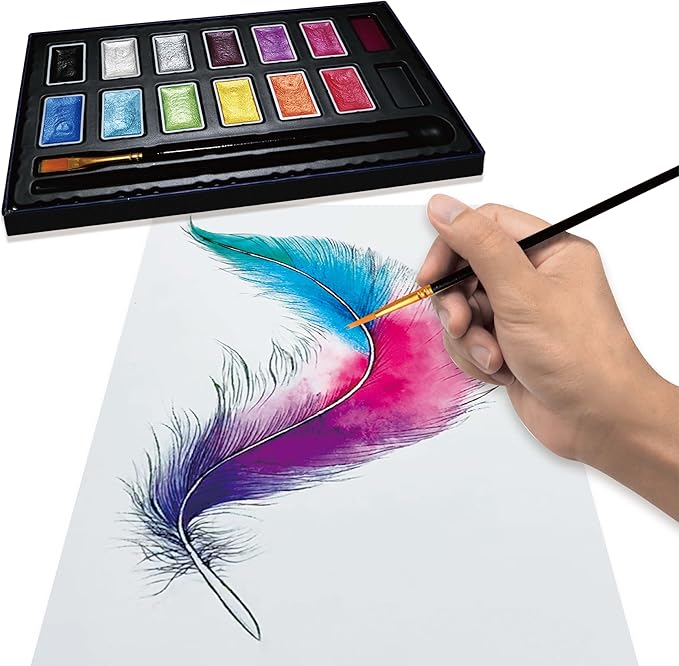 - Pearl Watercolor Paint Set - The GlisDyck professional watercolor kit features 12/36 vibrant colors with intense shimmer mineral pigments, Includes 2 brushes and 2 sinks. Metallic watercolor blend effortlessly, offering glitter effect on light/dark surfaces,Ideal for watercolor sets for adults &kids, the smooth formula dries quickly without clumping or flaking