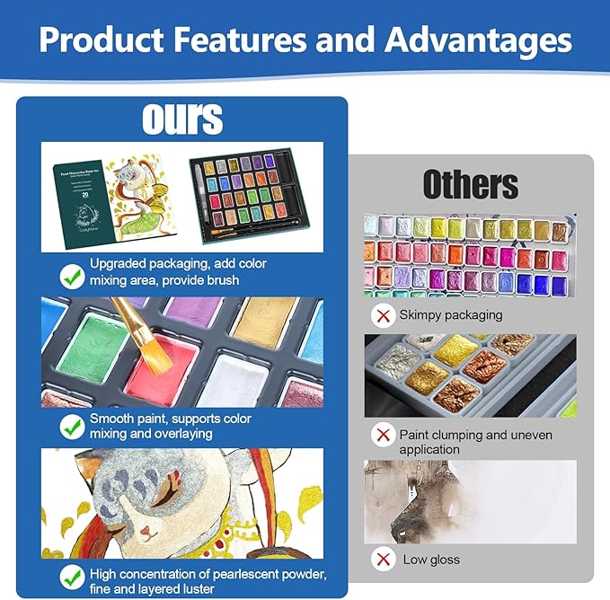- 【Color-Bleedable & Smudgeable】Professional watercolor paint set achieve a smudge effect. Water paint also allow custom mixing and blending to create various colors. Due to high pearl powder content, color vibrancy is slightly affected, but combining with regular watercolor paint sets enables an expanded color palette