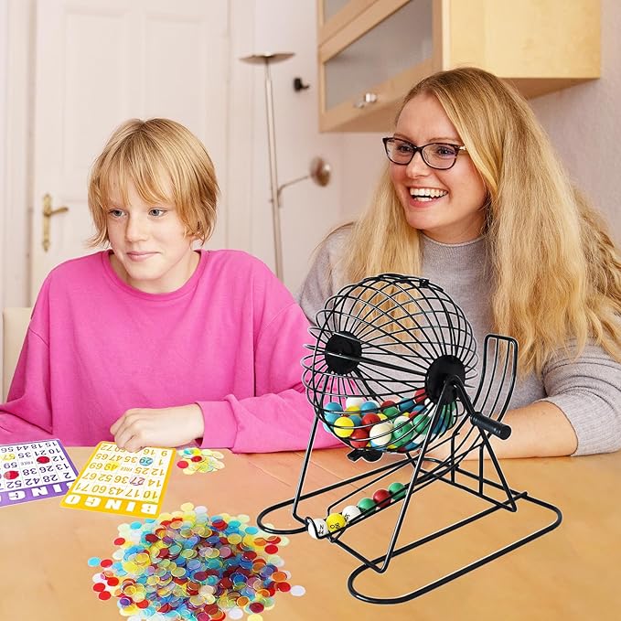 Yuanhe Complete Bingo Game Set - Includes 8" Metal Round Cage with Big Storage Bag,100 Bingo Cards,1000 Colorful Chips,75 Colored Balls and Masterboard, Ideal for Large Groups