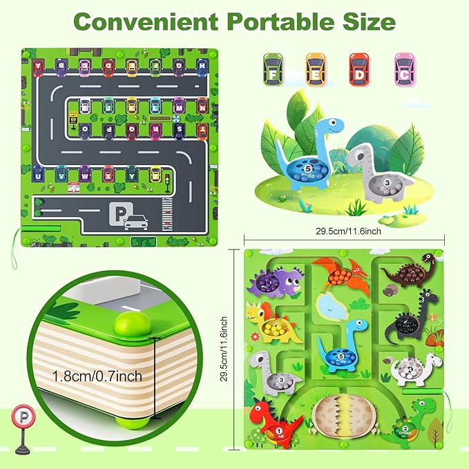 - Double the Learning, Double the Fun:This 2-in-1 magnetic maze board keeps kids engaged with a colorful dinosaur-themed color matching game on one side and an exciting car-themed alphabet maze on the other. It’s perfect for teaching letter recognition and color sorting—two critical skills in one toy!