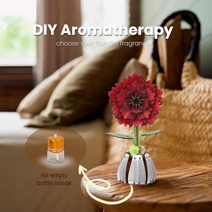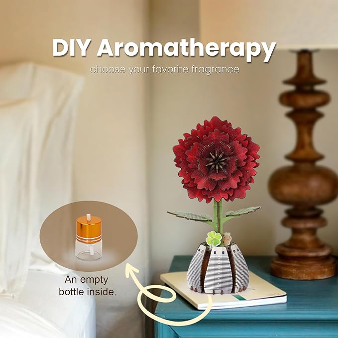 - 3D Wooden Puzzle Rose+ China Rose: The 3D wooden puzzle flowers aromatherapy puzzle set perfectly integrates the joy of puzzling, the allure of aromatherapy. put your favorite perfume or aromatherapy oil or essential oil inside the empty bottle which has diffuser stick . The bottle can be put under the flower base . when you close to the flowers, you can get not only nice visual sense, but also perfect smelling sense.