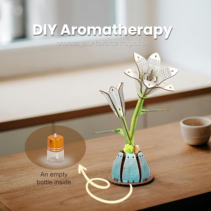 - 3D Wooden Puzzle Rose+ China Rose: The 3D wooden puzzle flowers aromatherapy puzzle set perfectly integrates the joy of puzzling, the allure of aromatherapy. put your favorite perfume or aromatherapy oil or essential oil inside the empty bottle which has diffuser stick . The bottle can be put under the flower base . when you close to the flowers, you can get not only nice visual sense, but also perfect smelling sense.