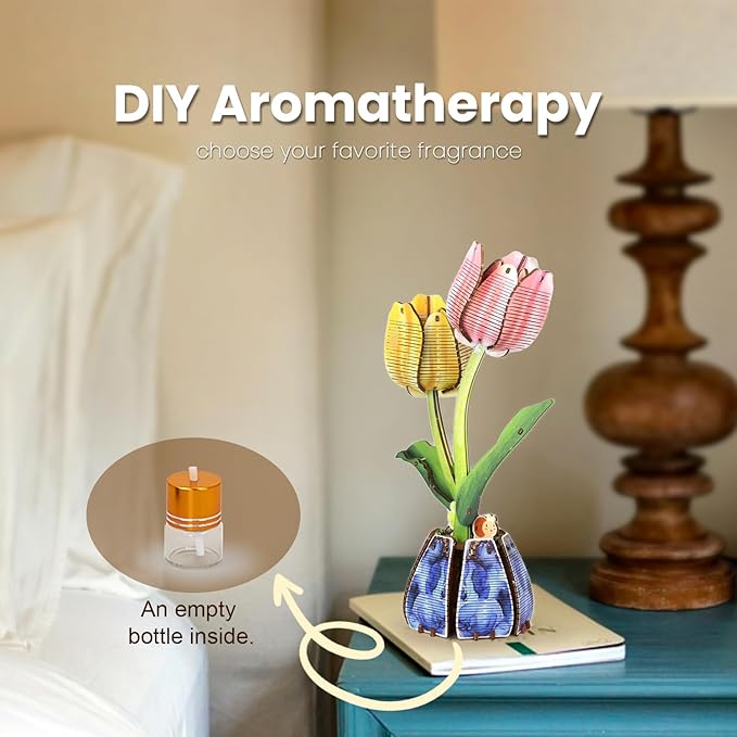 Jege 3D Flowers Wooden Puzzles for Adults,DIY Wooden 2 Flowers per Kit Building Set for Home Decor, Creative Craft Gift Toys Kits with 2 Perfume Bottles and Diffuser Sticks (Rose + Tulip)