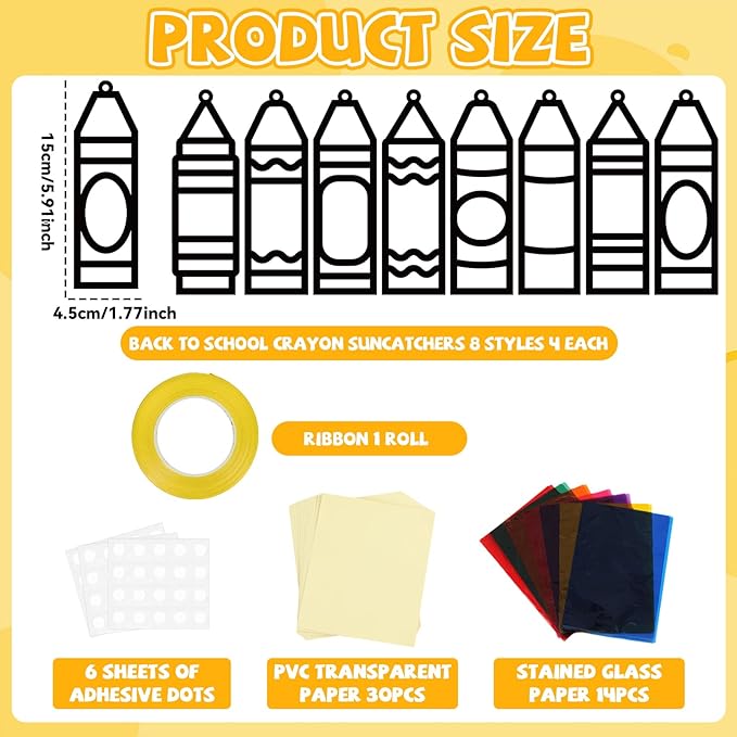 - Package includes: The crayon suncatcher crafts kit includes 32 pieces of crayon templates in 8 different designs, 14 sheets of cellophane, 32pcs of PVC transparent stickers, 1 roll of yellow ribbon, and 6 sheets of self-adhesive stickers. The considerate combination and sufficient quantity can meet your various DIY needs.