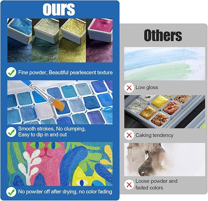 - 【Smooth Strokes, No Powder Off】Our watercolors paint set are extremely durability. Glitter watercolor remain highly stable, drying without crumbling or fading, making the watercolor painting shine forever. The fine powder texture makes the strokes of the pearl paint smooth and resists clumping