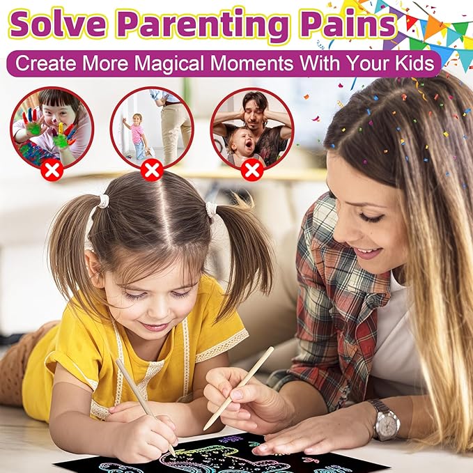 - Spark Imagination & Creativity: This fun scratch art paper is perfect for doodling, cards and illustrations, let your child unleash their creativity through vibrant scratch art, turning simple scratches into colorful masterpieces while developing artistic skills