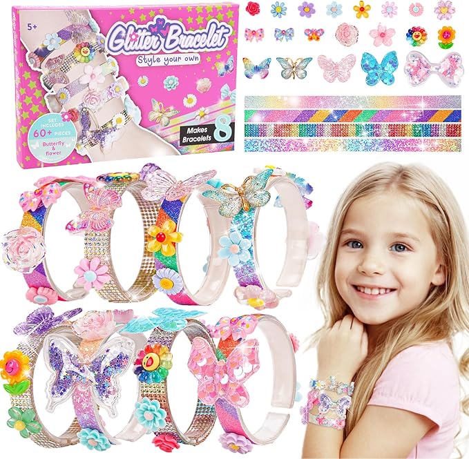 - 👭【Friendship Bracelet Making Kit for Girls 】The Charm Bracelet Making Kit is filled with acrylic bracelets*8,glitter strips*8,double-sided adhesive dots*2(64 dots), pretty charms*50(cute butterflys and flowers). Girls will love making these adorable butterfly and flower bracelets, which they can customize as they like. The friendships of 6-10-year-old girls will also deepen when they make these bracelets making kit.