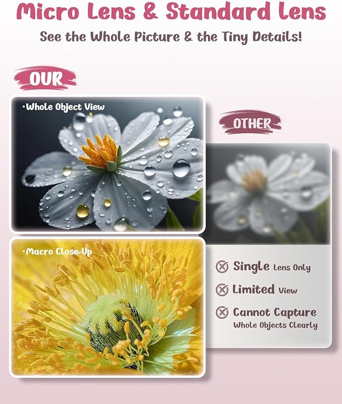 - 【2-IN-1 Kids Microscope Camera】The digital microscope also can be a kids camera!Unlocks both the micro and macro world, fueling scientific curiosity about everything around them.With 1000x magnification and 16x zoom, kids can explore plants, insects, coins, jewelry, stamps, etc.