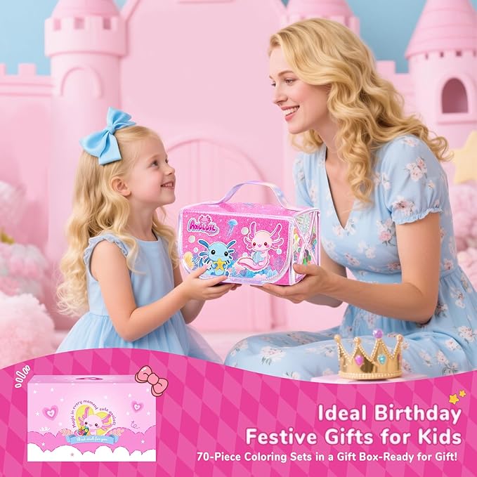 70PCS Axolotl Washable Markers Set with Glitter Pencil Case,Art Supplies for Kids Ages 4-6-8,Drawing Coloring Art Craft Kits for Girls with Marker,Glitter Pens,Crayon,Birthday Gifts Toys for Girls