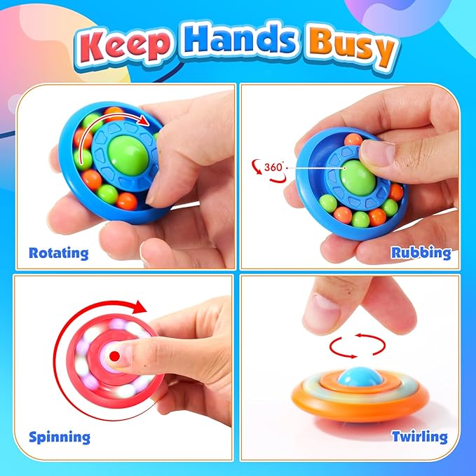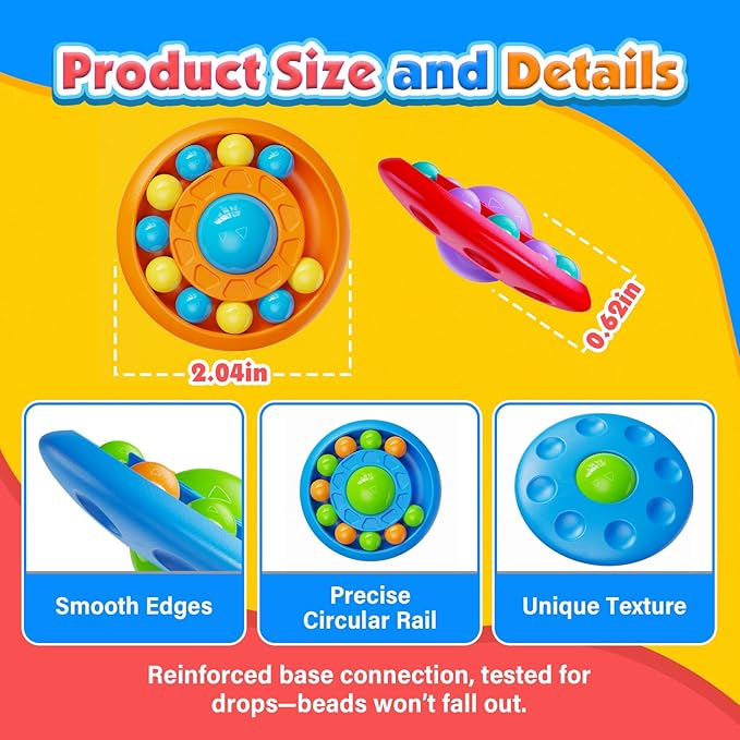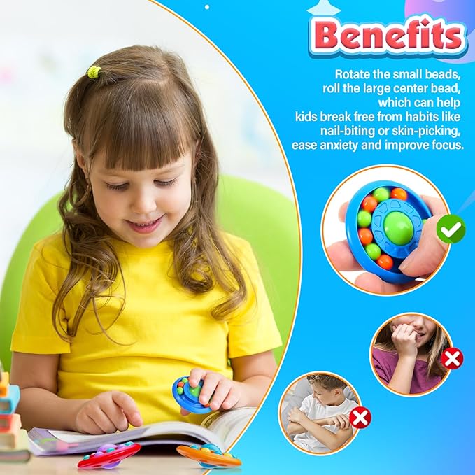 - 🌌Safe Fidget Toys for Kids Adults🌌--Crafted from BPA-free, non-toxic plastic with a smooth surface and rounded edges, this stress toy pack meets high safety standards for everyday use. It passed drop tests, with securely fixed bead and not easy to fall out. Whether spinning, rotating, or rolling, this small sensory fidget toy helps relieve stress, enhance focus, and calm anxious minds. Perfect for kids with ADHD, autism, or sensory needs, as well as adults.