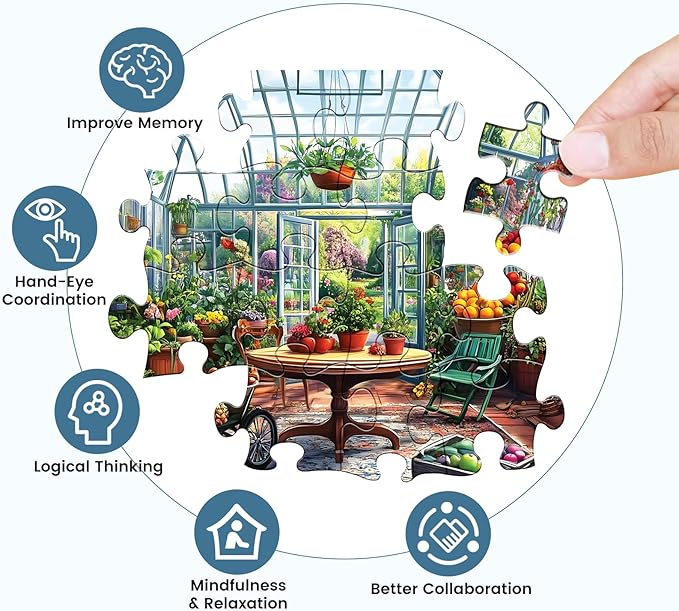 - Enchanting Garden Puzzle: Step into this greenhouse garden! Inside the glass-built greenhouse, a variety of plants and flowers are neatly arranged. Hanging potted plants and greenery placed throughout complement each other, exuding vitality and creating a warm, cozy gardening atmosphere.